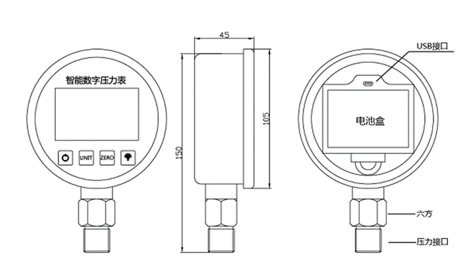 SUAY80电池供电压力表是一款高精度智能型数字压力表,内置高精度压力传感器,能够准确的实时显示压力,并且具有精度高、长期稳定性好的特点。配备5位显示的大尺寸LCD液晶显示,具有清零、背光、开关机、单位切换、低电压报警、峰值记录等多种功能,操作简单,安装方便。壳体和接头采用304不锈钢,抗震性好,能够测量气体、液体、油等对不锈钢无腐蚀的介质。用3节5号电池供电,也可以采用USB供电,续航功耗低、时间长,适用于便携式压力测量、设备配套、校验设备等压力测量领域。